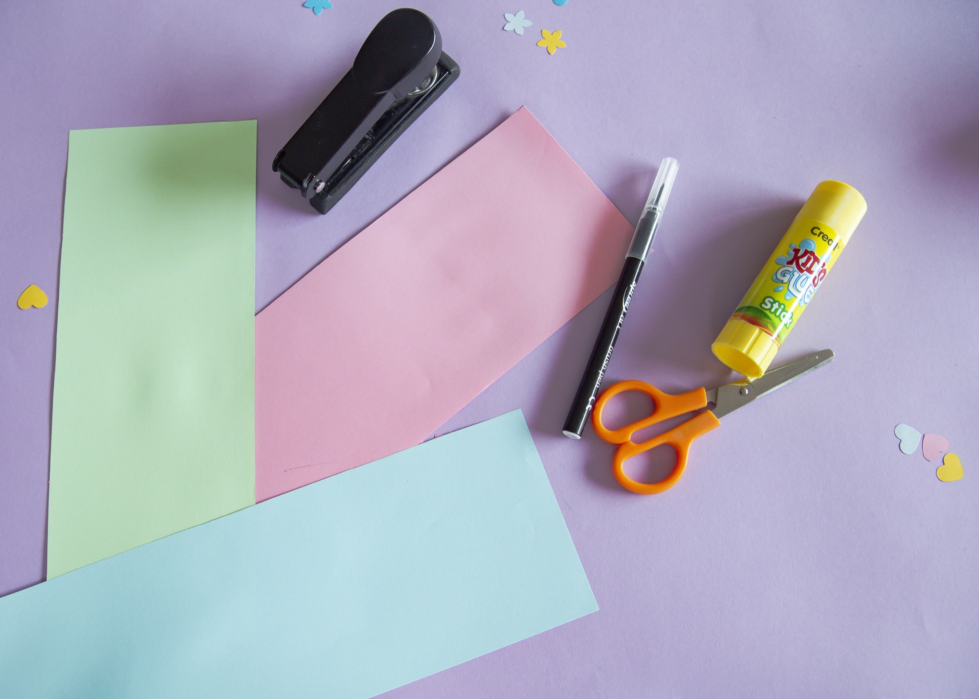 Étape 2 : enroule chaque bande de papier sur elle-même et agrafe-les pour les maintenir en forme de cylindre. Tu peux également utiliser des rouleaux de papier toilette et coller directement tes papiers de couleur dessus.