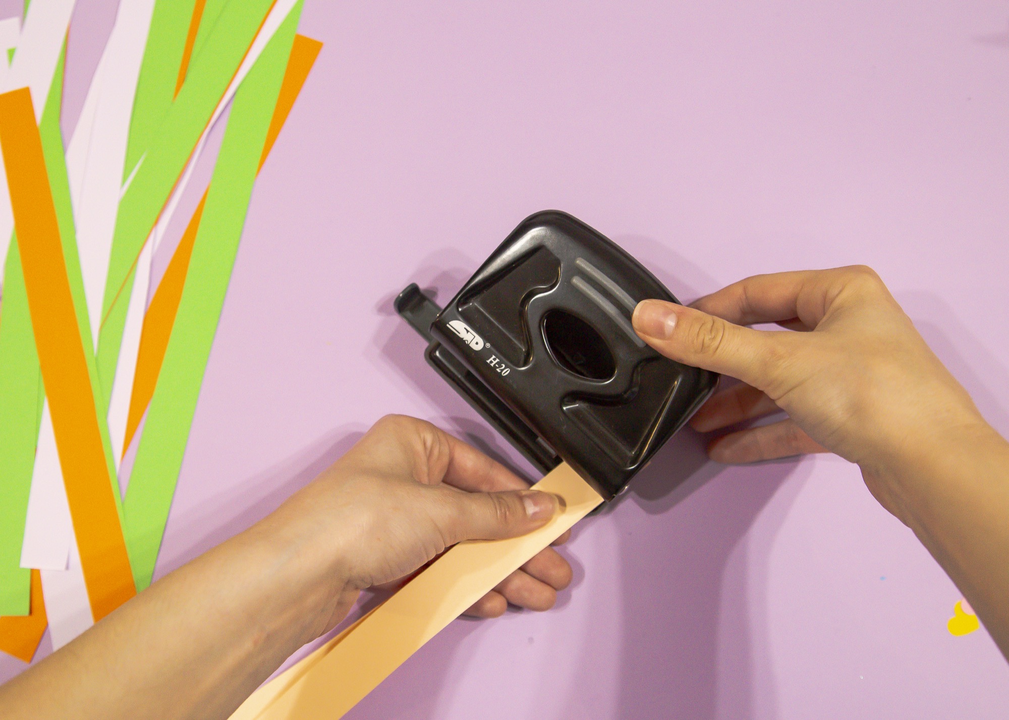 Étape 3 : à l’aide de ta trouilloteuse, poinçonne chaque bande à chaque bout.
