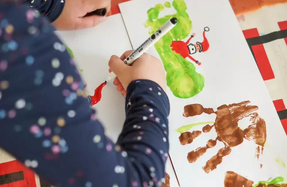 Une fois que les empreintes sont bien sèches, on passe au dessin. J’ai fait un modèle à ma fille qui a reproduit le dessin sur sa feuille. On commence par dessiner le Père Noël.