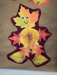 Màj du 13 sept : aujourd’hui, on a travaillé avec des feuilles mortes, une première. Et première création pour mon fils ainé : un bonhomme de la tête au pied. 😀