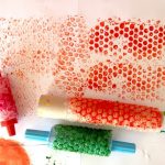 Principe simple : enrouler son rouleau de pâtisserie de papier bulle. On plonge l’ensemble dans la peinture et on peint. Le tout donne un beau motif. 🙂
