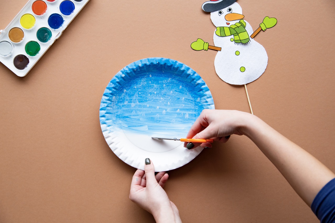 Une fois la peinture sèche, réalise une entaille au centre de bas de l’assiette pour y insérer le bâtonnet de ton bonhomme de neige.
