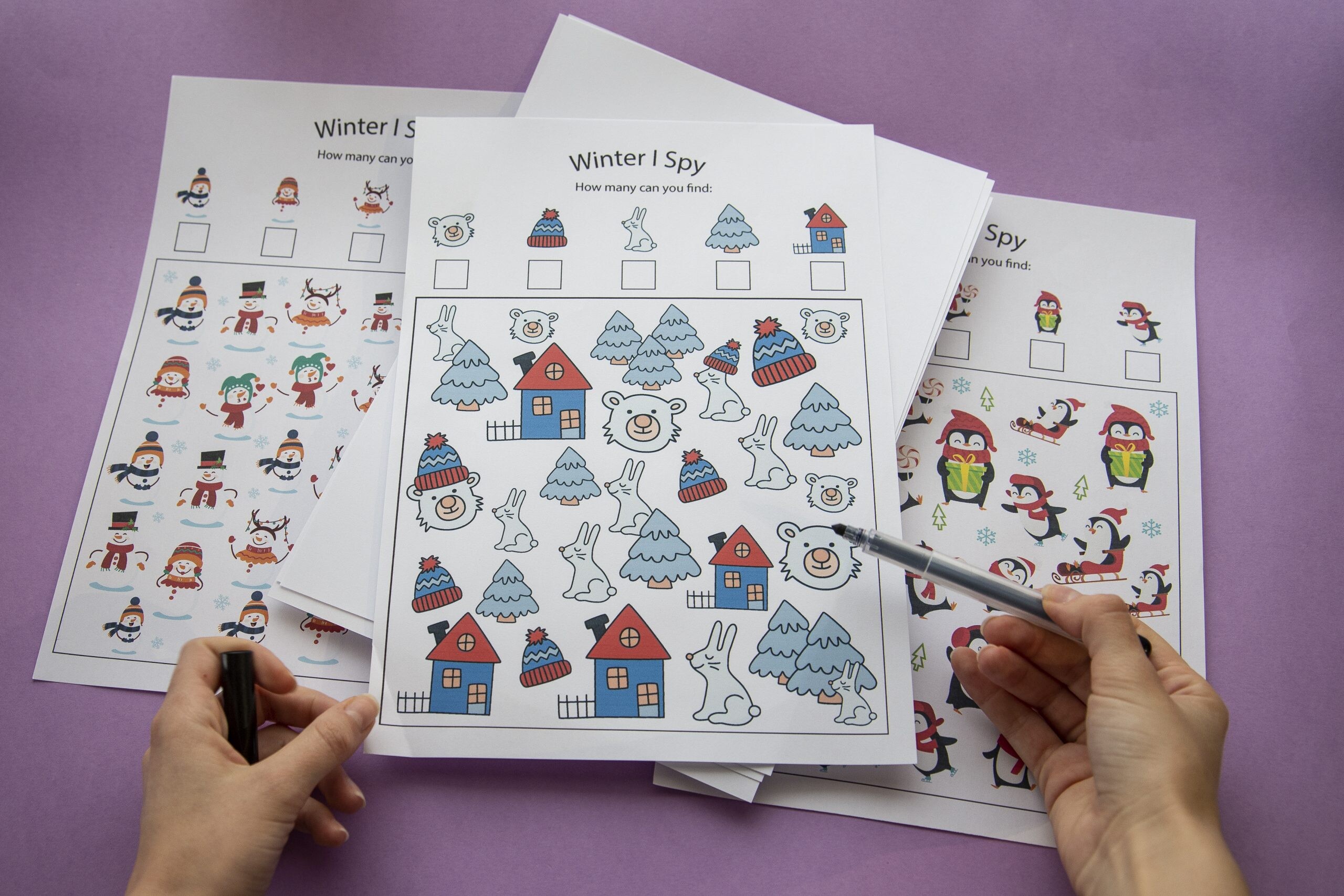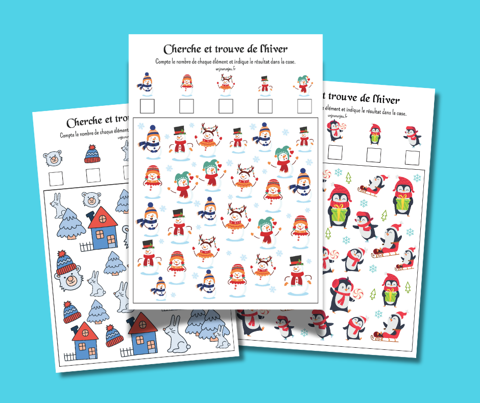 3 cherche et trouve spécial hiver à télécharger et à imprimer pour divertir tes enfants pendant les froides journées de janvier et février.