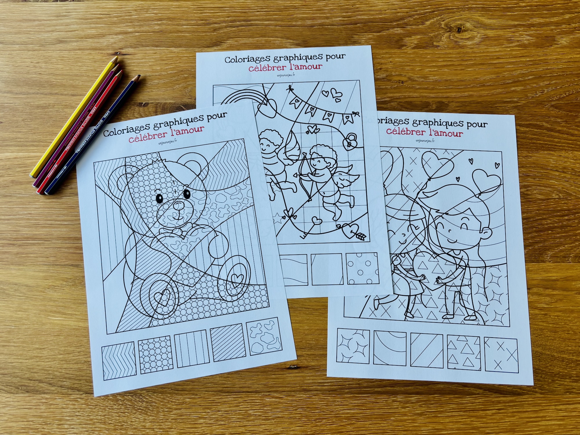 Avec notre nouveau support “3 coloriages graphiques pour célébrer l’amour”, on te propose une activité toute simple et idéale pour :