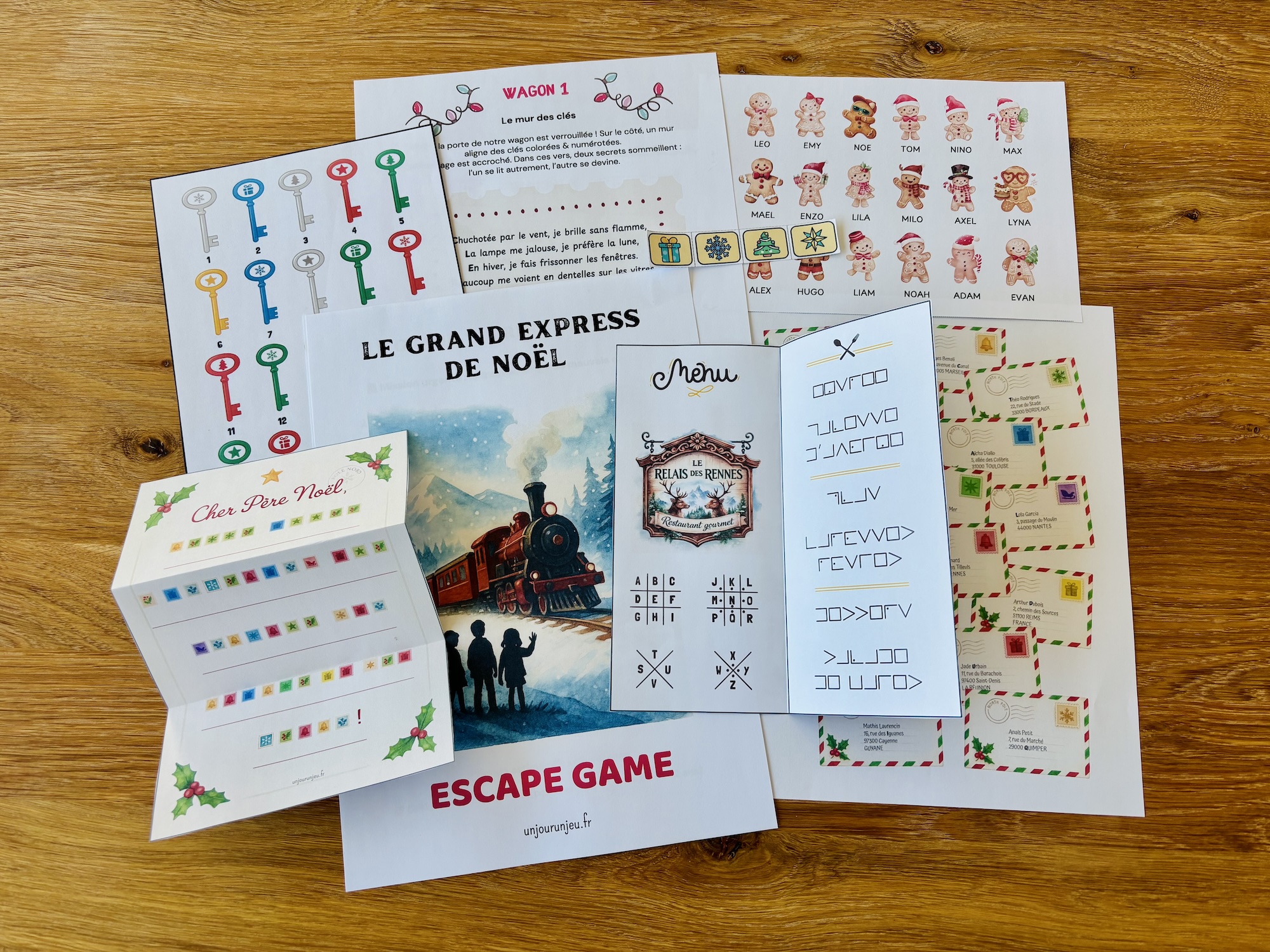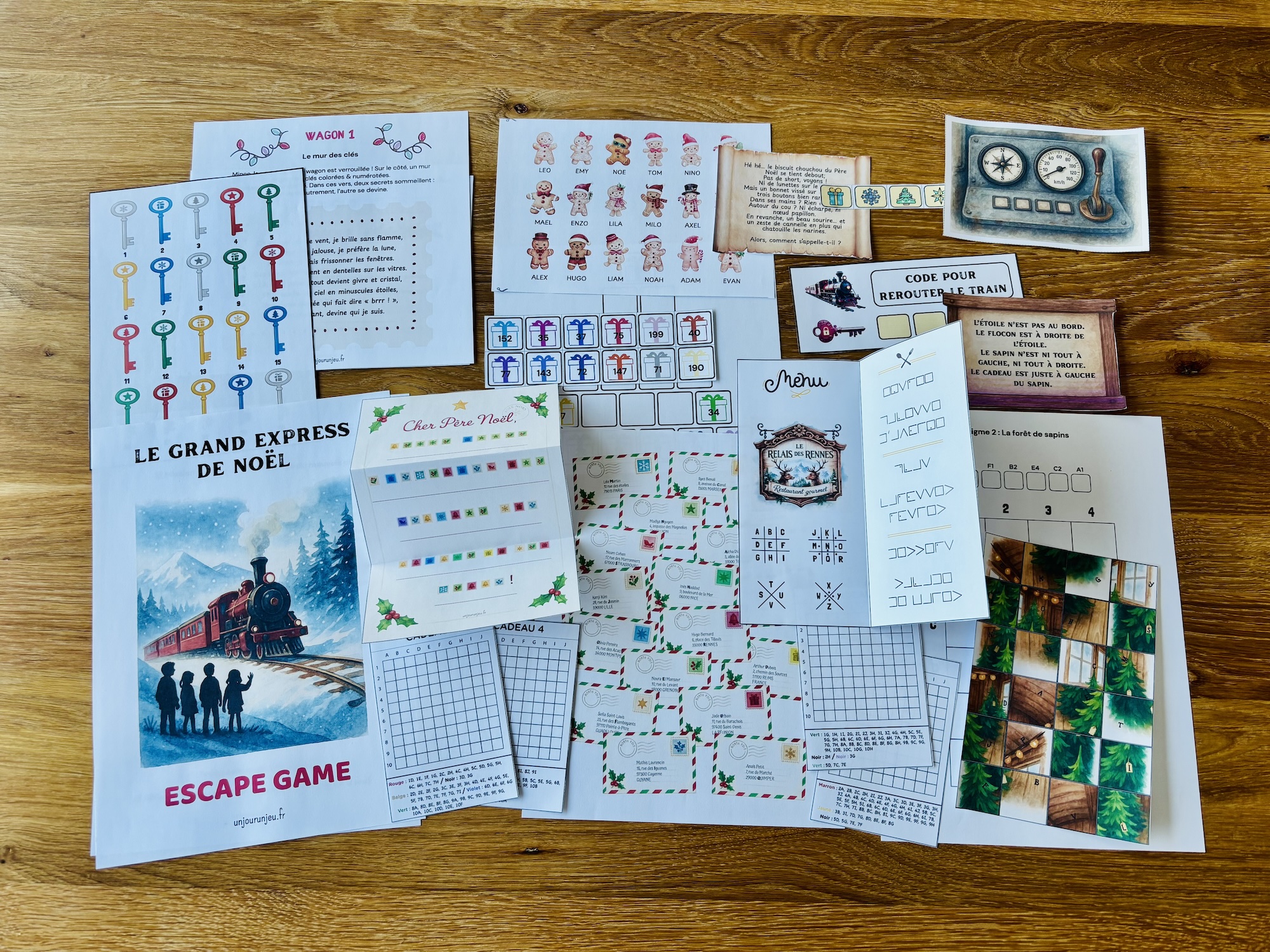 Le livret de mission, les fiches des wagons avec leurs visuels, la lettre et les timbres de la Poste, les grilles pixel art, la pyramide des cadeaux, la planche des bonhommes de pain d’épices, le menu codé du restaurant des rennes, le pupitre de la locomotive avec les symboles, les solutions détaillées et les conseils d’installation. Tout est prêt : il ne vous reste qu’à découper et glisser quelques indices au bon moment.