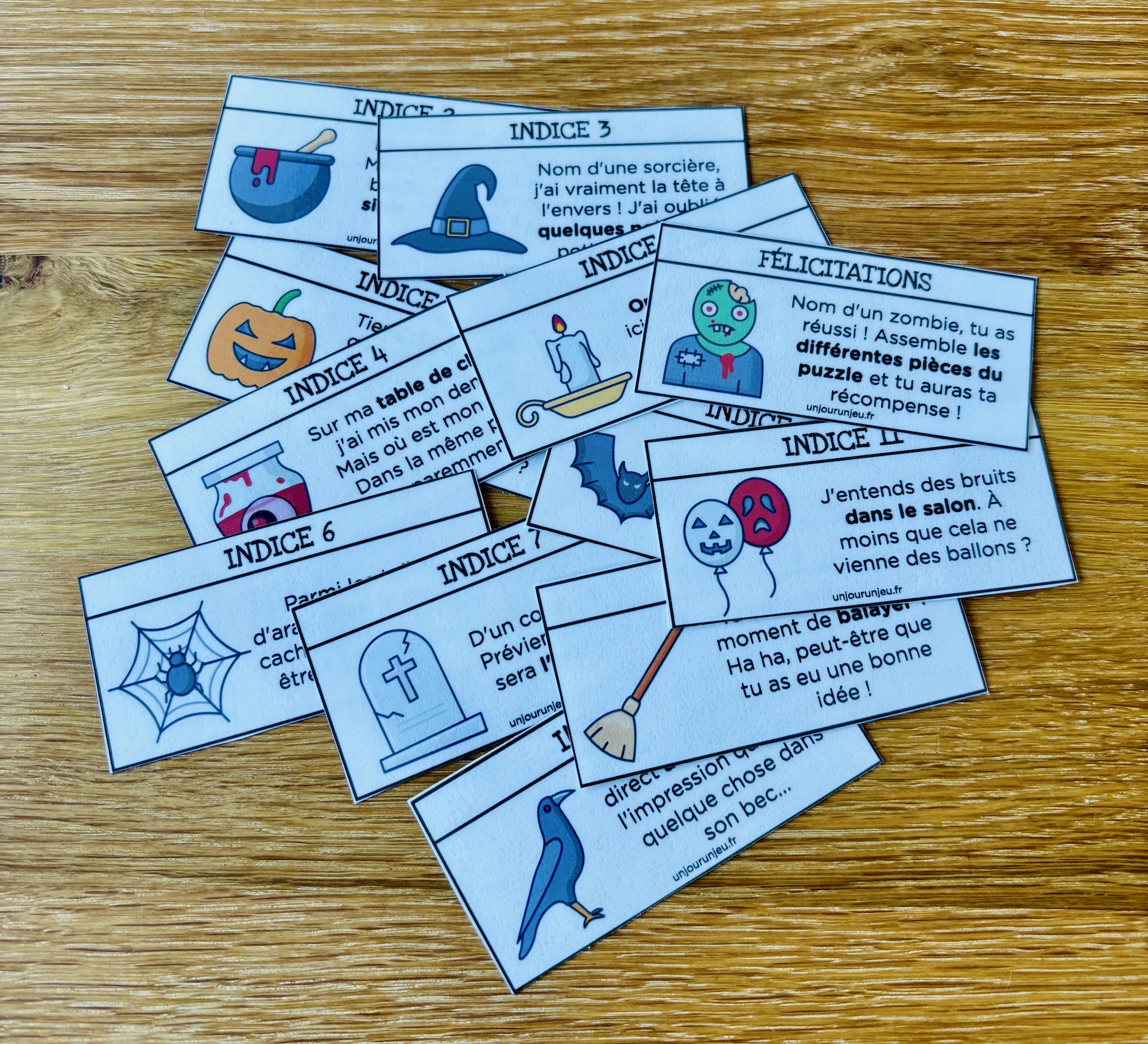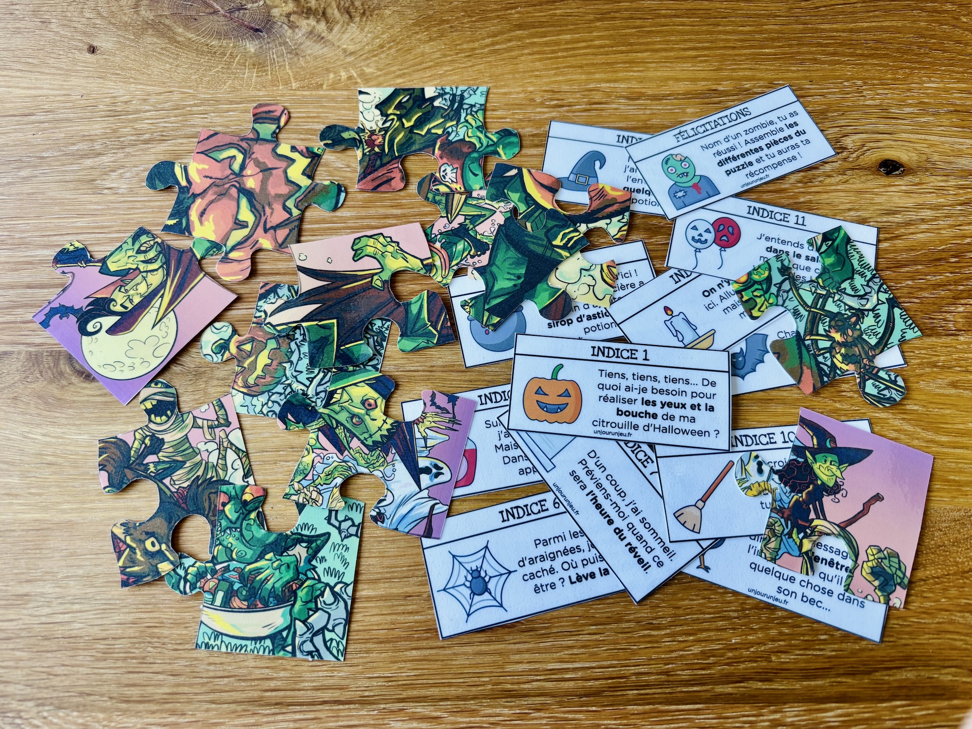 Vous allez pouvoir amuser vos enfants le 31 octobre en cachant 12 pièces de puzzle à travers la maison ou dans l’appartement, ainsi que 11 indices pour tenter de les retrouver.