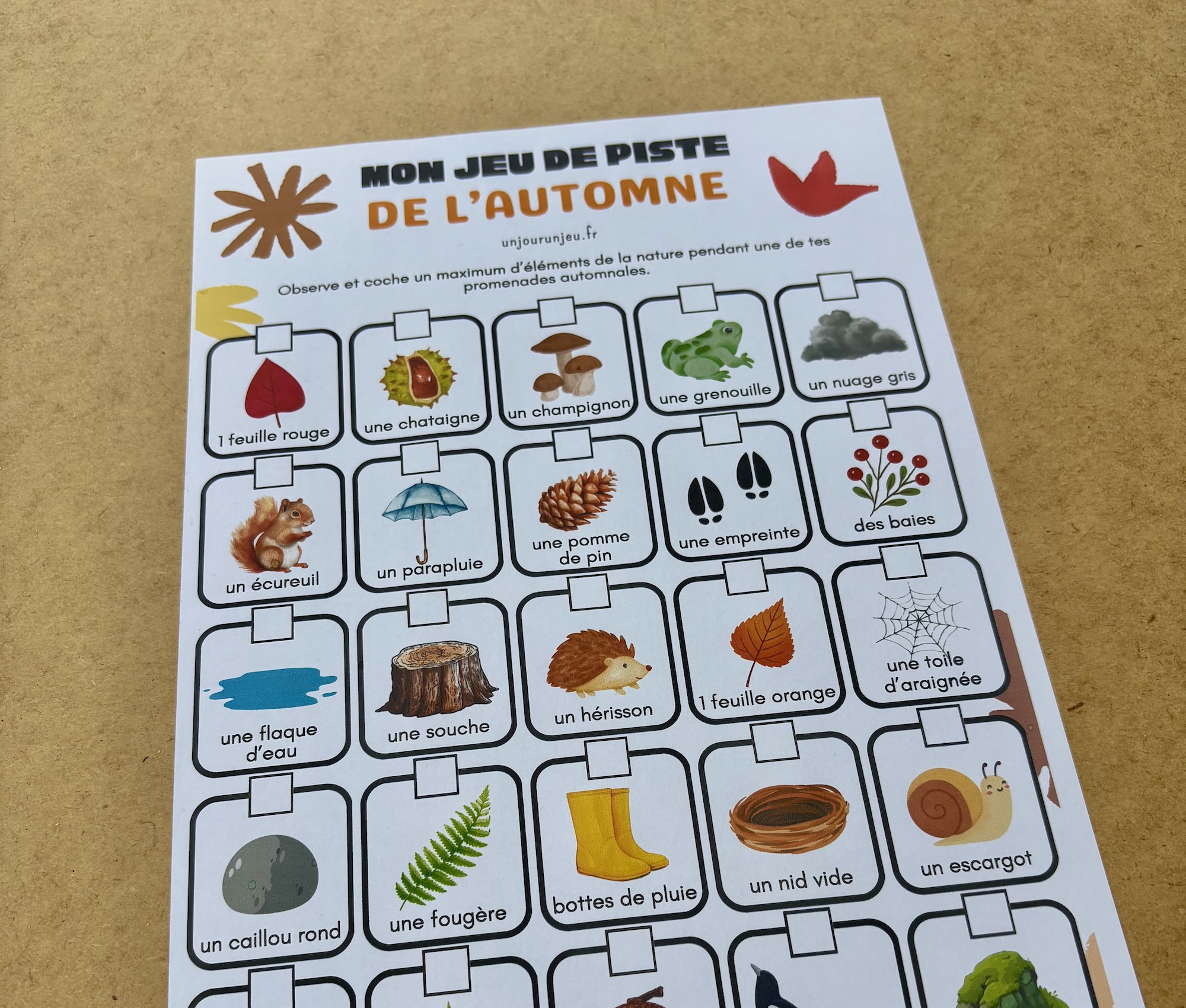 Pour rendre ces promenades encore plus amusantes, nous avons créé un jeu de piste de l’automne à imprimer. L’enfant a sous les yeux une grille remplie d’éléments typiques de la saison : une feuille rouge, une pomme de pin, un hérisson, un écureuil, une empreinte, un escargot…