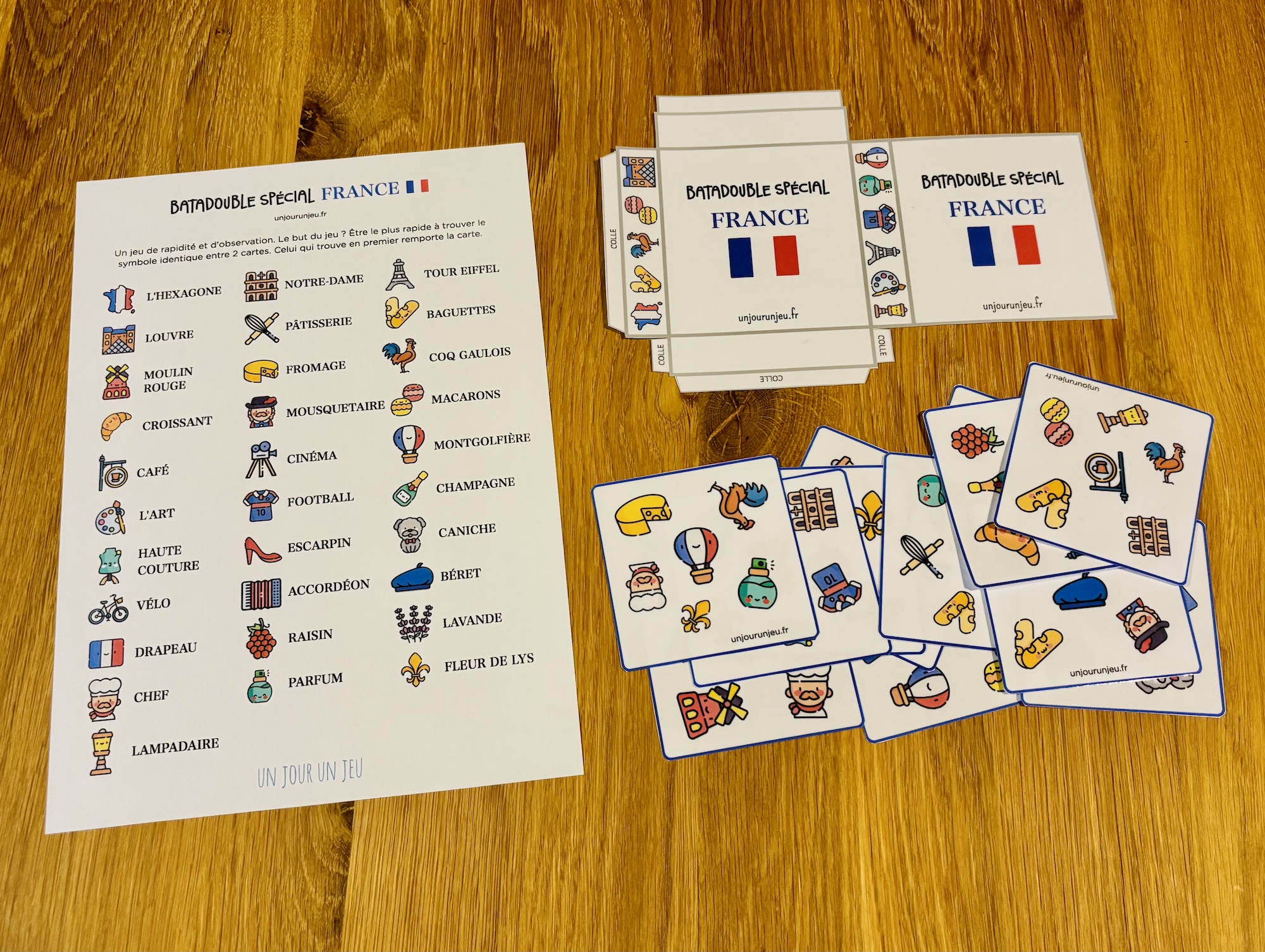 Avec ce jeu des doubles spécial France, on garde exactement ce mécanisme (qui marche à tous les coups), mais on le transforme en petit voyage à travers la culture française. Sur les cartes, tu trouveras des symboles inspirés de la France : monuments, objets du quotidien, spécialités, éléments de culture et de patrimoine… De quoi jouer tout en renforçant la mémoire visuelle et en enrichissant le vocabulaire.